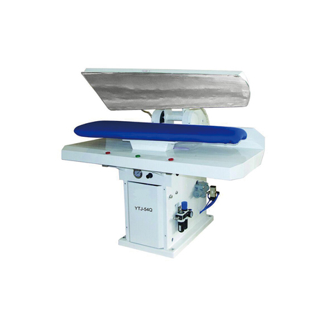 Loja de roupa usar equipamento de passar, como tábua de engomar, máquina da imprensa do vapor. Formulário de acabamento